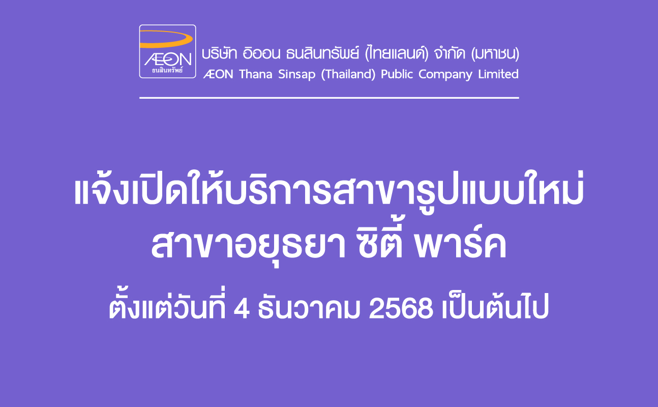 บริษัท อิออน ธนสินทรัพย์ (ไทยแลนด์) จำกัด (มหาชน) ขอเรียนให้ท่านทราบว่า อิออนสาขาอยุธยา ซิตี้ พาร์ค ชั้น 1 จะเปิดให้บริการในรูปแบบใหม่ ตั้งแต่วันที่ 4 ธันวาคม 2568 เป็นต้นไป