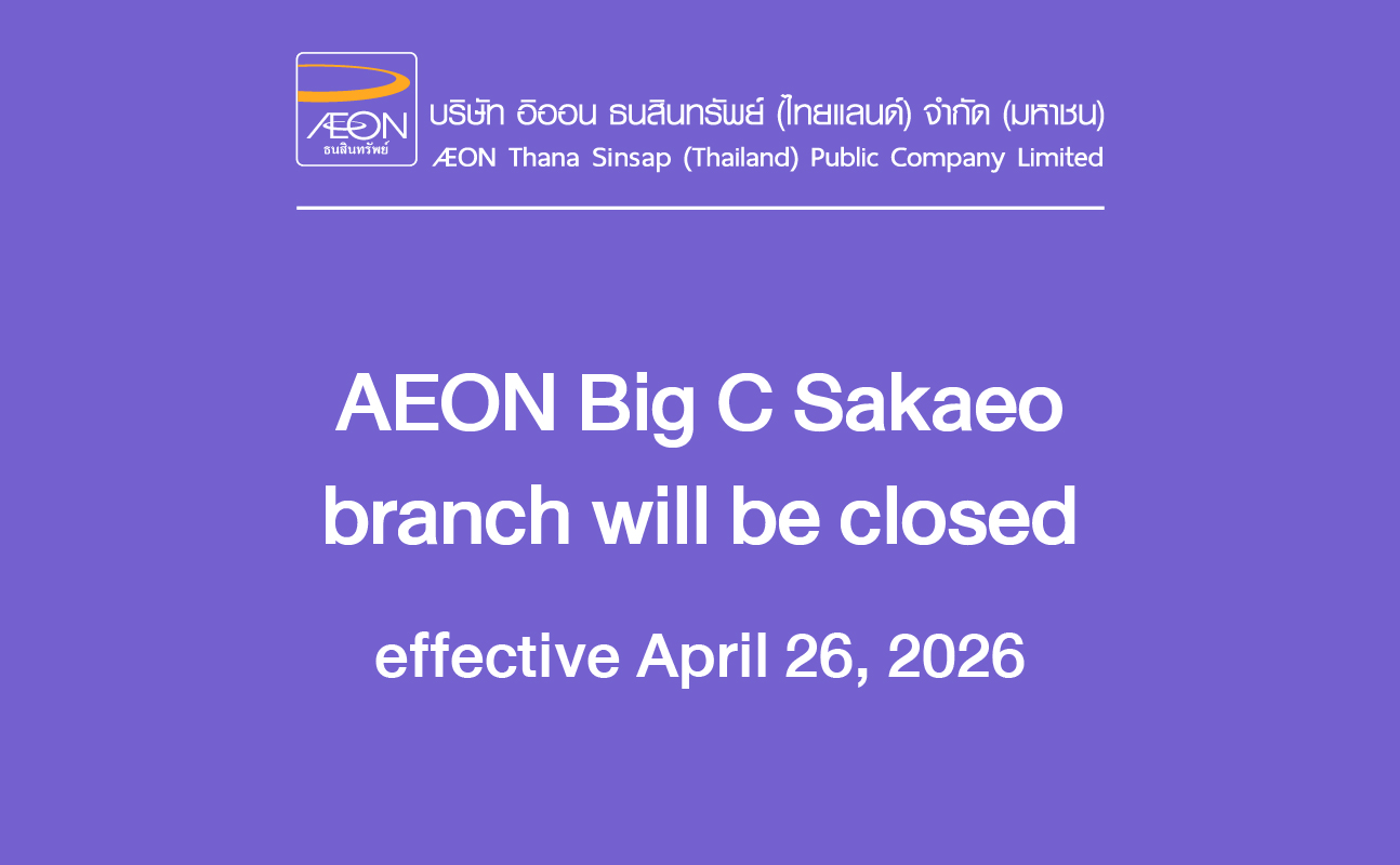 AEON Thana Sinsap (Thailand) Public Company Limited would like to inform you that the company will permanently close the Big C Sakaeo Branch will be permanently closed effective from April 26, 2026.