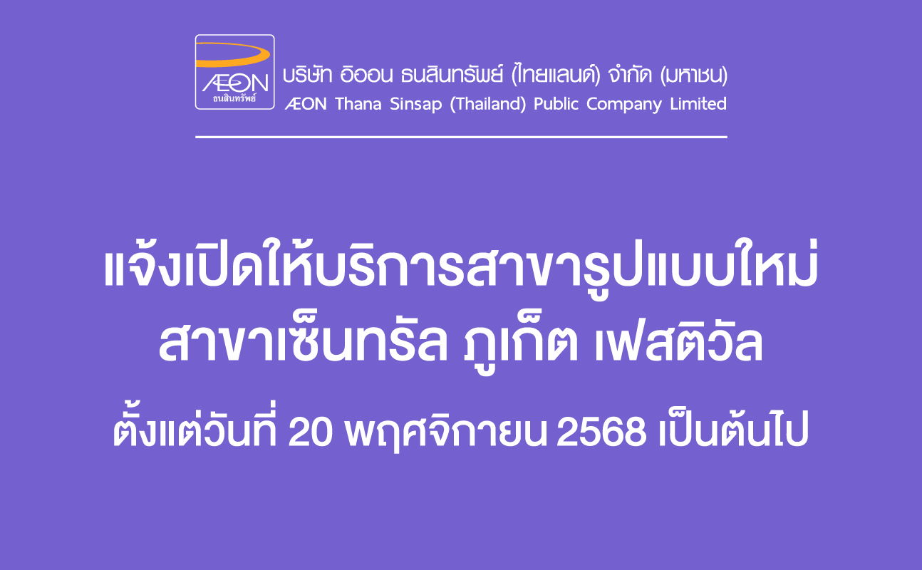 บริษัท อิออน ธนสินทรัพย์ (ไทยแลนด์) จำกัด (มหาชน) ขอเรียนให้ท่านทราบว่า อิออน สาขาเซ็นทรัล ภูเก็ต เฟสติวัล ชั้น 4 จะเปิดให้บริการในรูปแบบใหม่ ตั้งแต่วันที่ 20 พฤศจิกายน 2568 เป็นต้นไป
