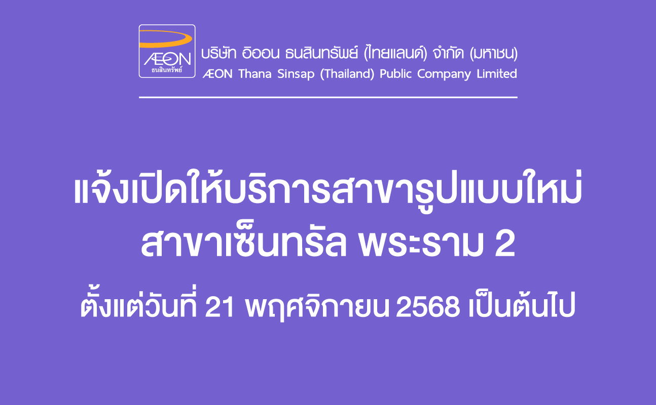 บริษัท อิออน ธนสินทรัพย์ (ไทยแลนด์) จำกัด (มหาชน) ขอเรียนให้ท่านทราบว่า อิออนสาขาเซ็นทรัล พระราม 2 ชั้น G จะเปิดให้บริการในรูปแบบใหม่ ตั้งแต่วันที่ 21 พฤศจิกายน 2568 เป็นต้นไป