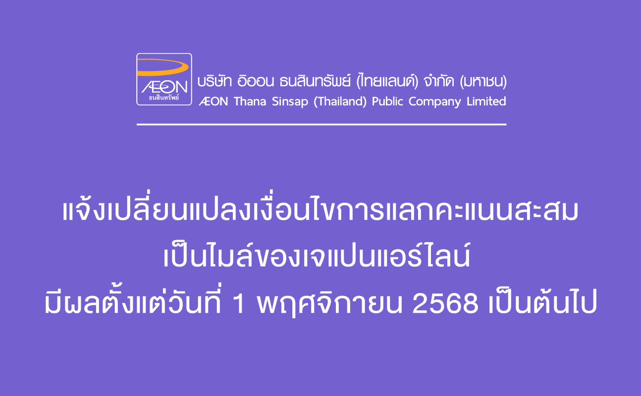 บริษัท อิออน ธนสินทรัพย์ (ไทยแลนด์) จำกัด (มหาชน) (“บริษัทฯ”) ขอแจ้งเปลี่ยนแปลงเงื่อนไขใหม่ สำหรับการแลกคะแนนสะสมเป็นไมล์ของเจแปนแอร์ไลน์/ JAL Mileage Bank (JMB) ดังนี้
