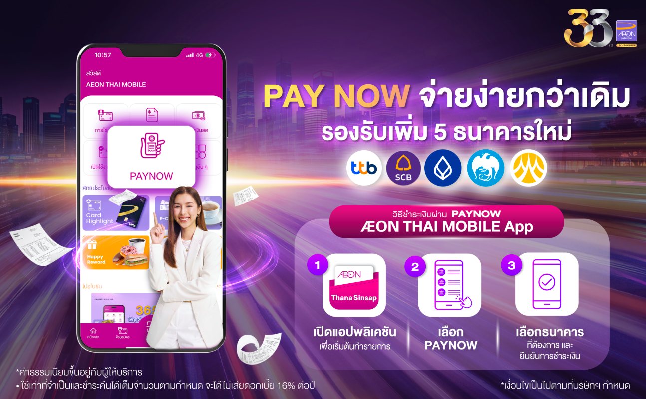 เพิ่มบริการ PAYNOW โดยขยายช่องทางการชำระเงินกับ 5 ธนาคาร ผ่าน AEON THAI MOBILE สะดวกกว่ายิ่งขึ้น ! แค่เพียงคุณมีแอปธนาคารที่ร่วมรายการ คุณก็สามารถทำรายการชำระเงินค่าบัตรเครดิต สินเชื่อได้ และวงเงินคืนเข้าระบบทันที