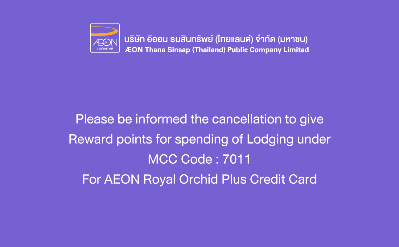 AEON Thana Sinsap (Thailand) Public Company Limited (“Company”) would like to inform that AEON Happy Reward Points will be cancellation when spending through AEON Royal Orchid Plus World Mastercard and AEON Royal Orchid Plus Platinum