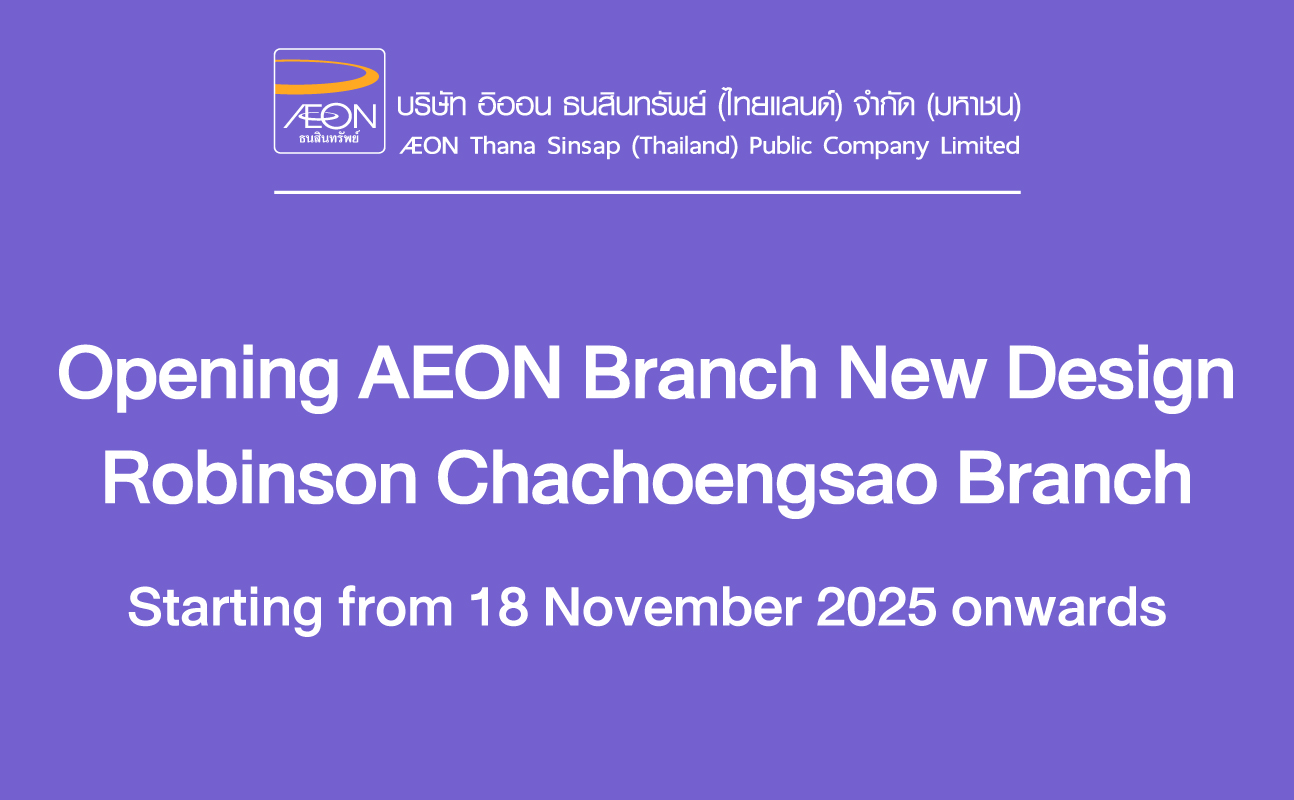 AEON remains committed to continuously improving our service quality to provide you with the best experience possible.For further information or inquiries, please contact our Customer Service team at Tel. 0-2665-0123, available daily from 09:00 to 18:00 hrs.