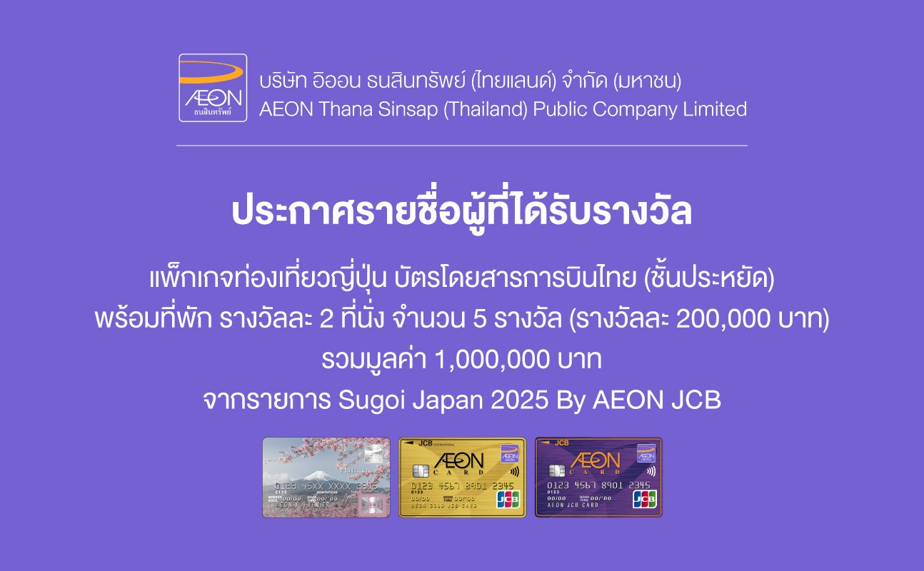 บริษัท อิออน ธนสินทรัพย์ (ไทยแลนด์) จำกัด มหาชน ขอแจ้งรายชื่อลูกค้าที่ได้รับรางวัลจากรายการส่งเสริมการขาย “Sugoi Japan 2025 by AEON JCB” สำหรับผู้ที่เข้าร่วมรายการส่งเสริมการขายกับอิออน ภายใต้เงื่อนไขของบริษัทฯ ระหว่างวันที่ 1 กรกฏาคม – 31 สิงหาคม 2568 รับแพ็คเกจท่องเที่ยวญี่ปุ่น บัตรโดยสารการบินไทย (ชั้นประหยัด) พร้อมที่พัก 5 วัน 3 คืน สำหรับ 2 ท่าน จำนวนรวม 5 รางวัล รวมมูลค่า 1,000,000 บาท โดยรายชื่อทั้ง 5 ท่าน มีดังนี้