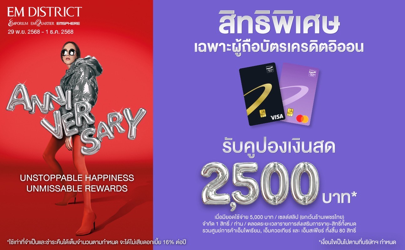 - สิทธิพิเศษสำหรับผู้ถือบัตรเครดิตอิออนทุกประเภท (ยกเว้นบัตรเครดิตเพื่อองค์กร) ที่ออกโดยบริษัท อิออน ธนสินทรัพย์ (ไทยแลนด์) จำกัด (มหาชน) (“บริษัทฯ”) เมื่อมียอดใช้จ่ายผ่านบัตรเครดิตอิออน ณ ร้านค้าภายในศูนย์การค้าเอ็มโพเรียม, เอ็มควอเทียร์ และเอ็มสเฟียร์ ระหว่างวันที่ 29 พฤศจิกายน 2568 – 1 ธันวาคม 2568 (3 วัน)